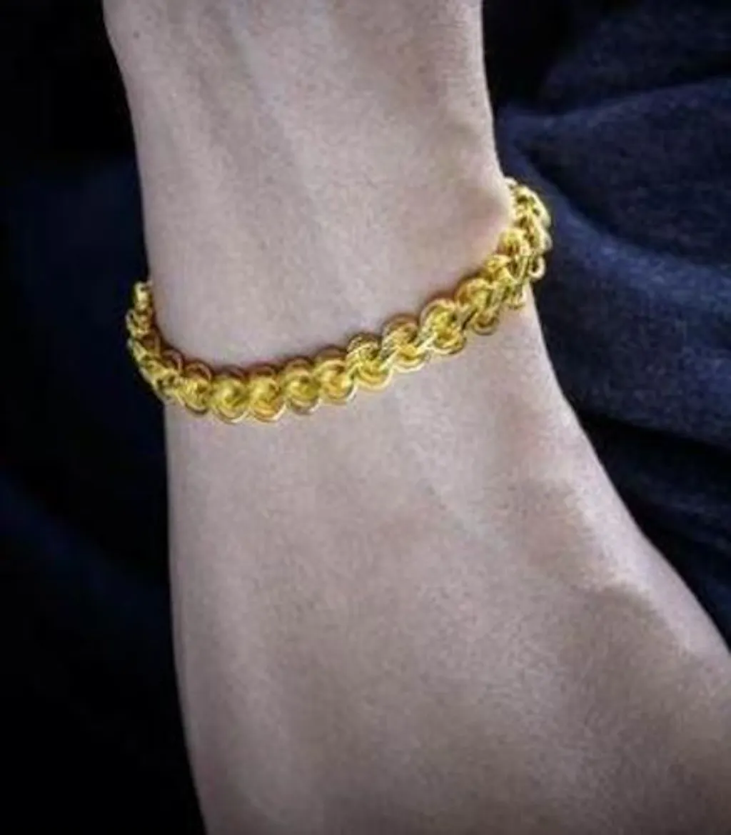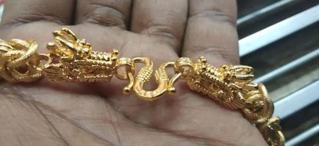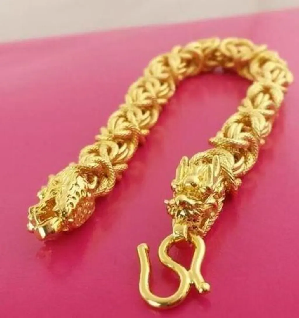 Caratterizzato dal favoloso drago a doppia testa , questo bracciale emana un'atmosfera maestosa con la sua placcatura in oro 18 carati di alta qualità . Le due catene d'oro sono tenute insieme da due draghi dorati.